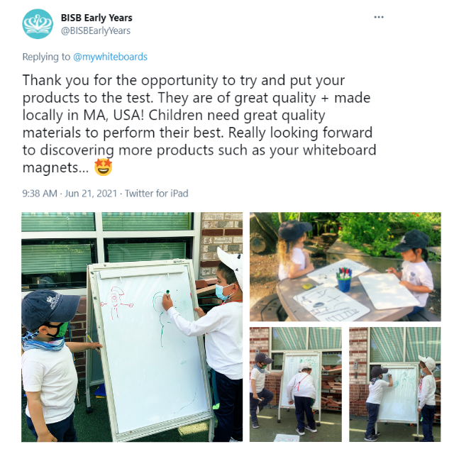 “On a mywhiteboards board, the writing is smooth and easy to erase/clean. The children always enjoy the opportunity to practice their writing skills on a graffiti wall. This old whiteboard is back up and running thanks to mywhiteboards! The children love brainstorming and sharing their knowledge through mark making with their peers & teachers. Good quality classroom provisions allow students to express themselves fully. Children need great quality materials to perform their best. Thank you for the opportunity to try and put your products to the test. They are of great quality + made locally in MA, USA! Really looking forward to discovering more products such as your whiteboard magnets.” -Nursery at BISB
